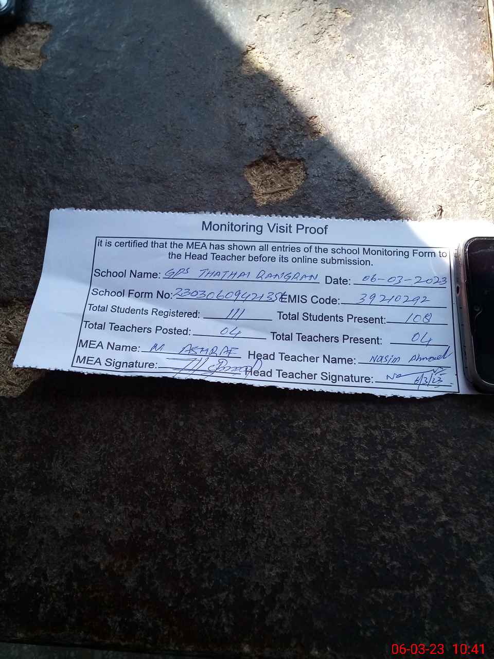 | Attendance Register | Head Teacher | MEA with School | Visit Proof |