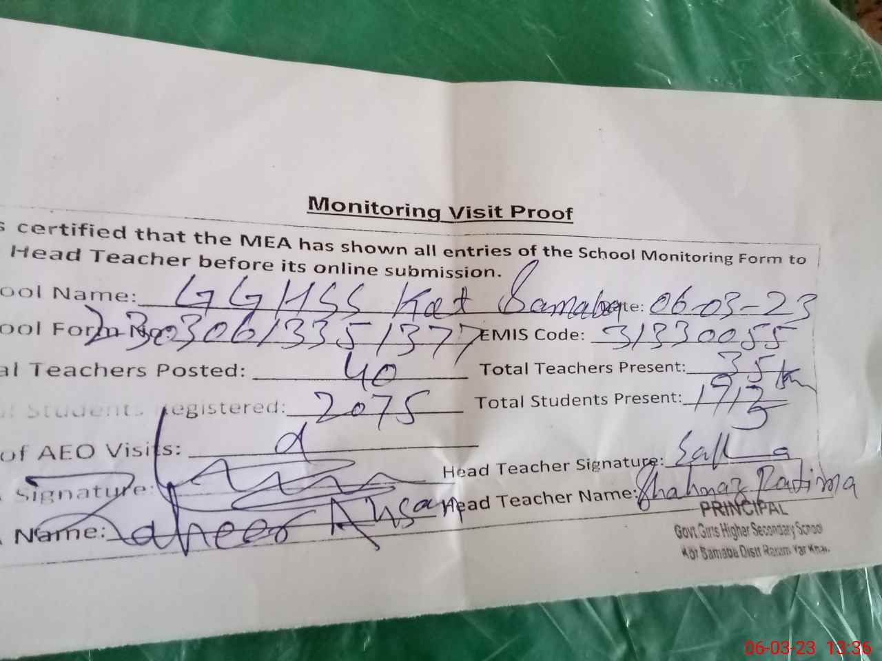 | Attendance Register | Head Teacher | MEA with School | Visit Proof |