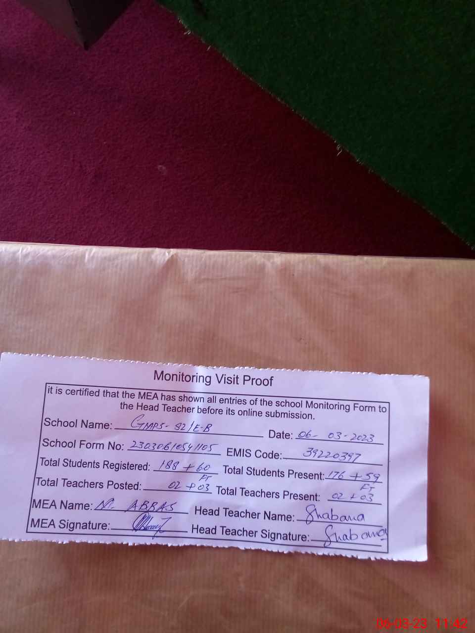 | Attendance Register | Head Teacher | MEA with School | Visit Proof |