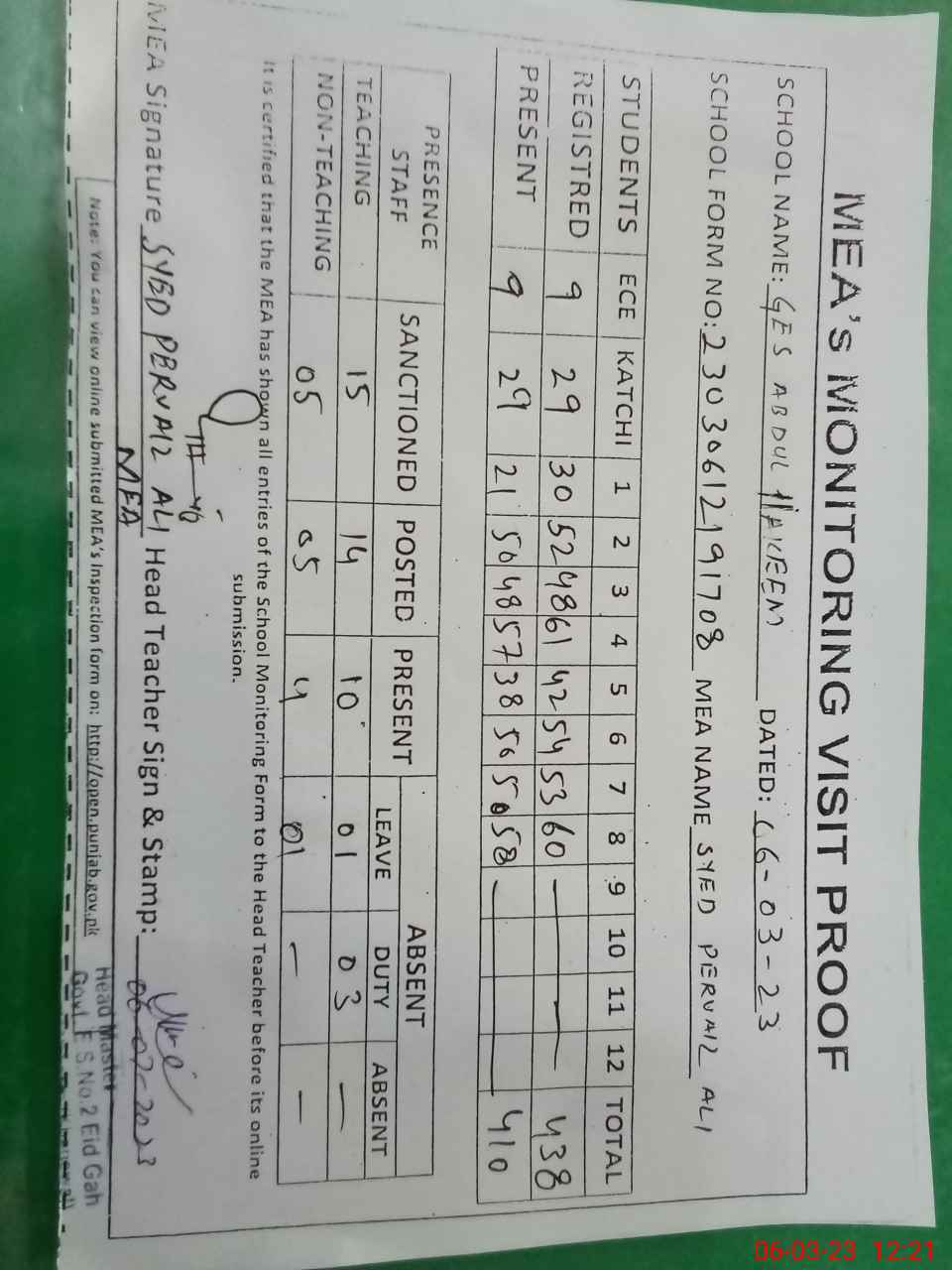 | Attendance Register | Head Teacher | MEA with School | Visit Proof |