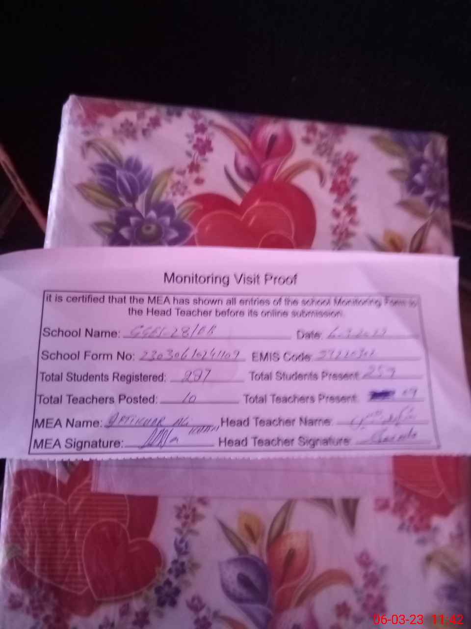 | Attendance Register | Head Teacher | MEA with School | Visit Proof |