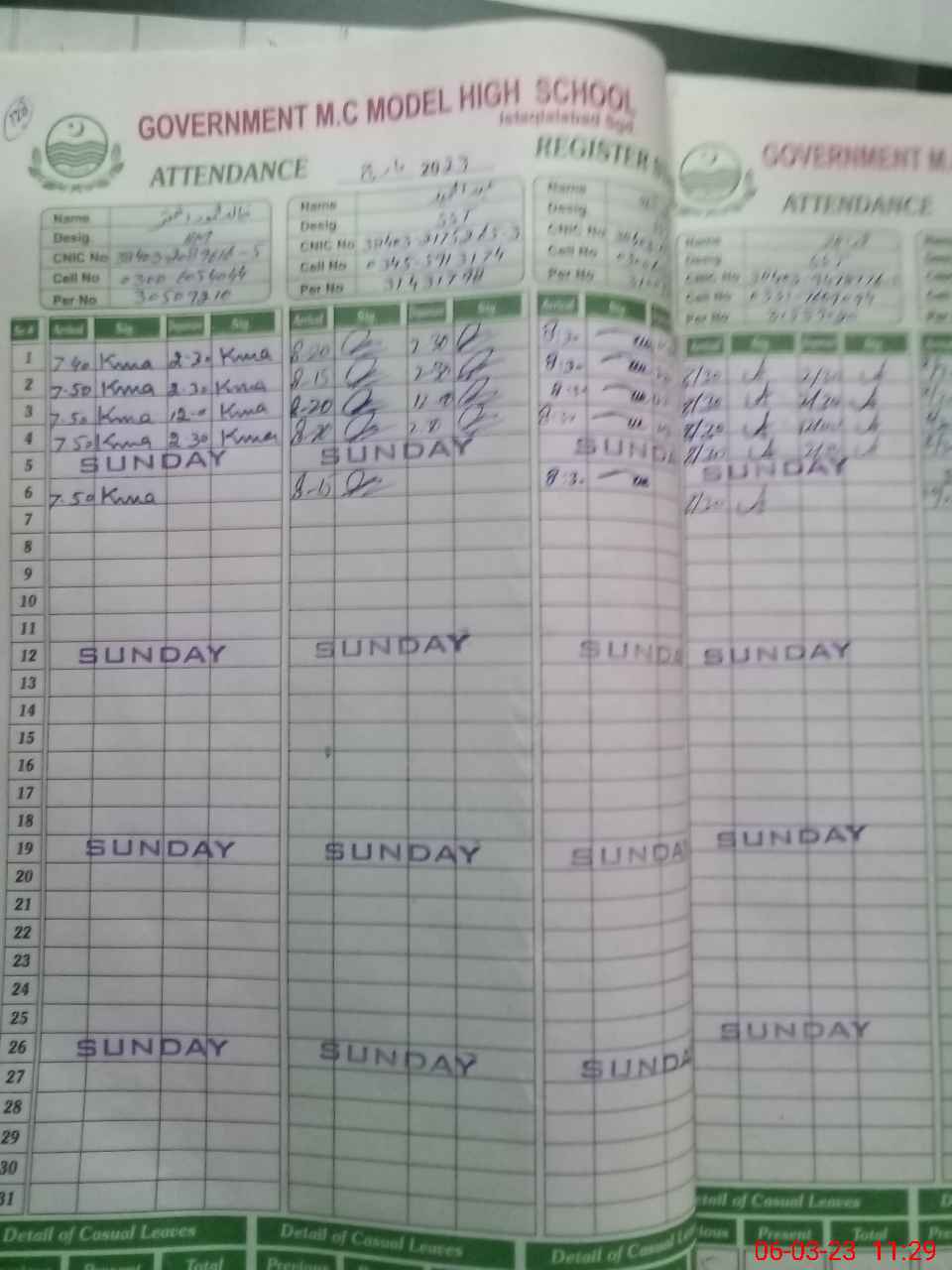 | CNIC | Full Name | Designation | R/C | Absence During Last Calender Month |