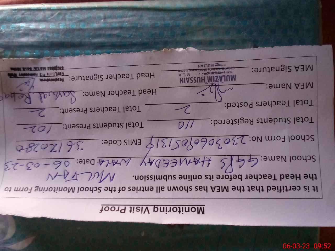 | Certified that this School was Inspected by the Undersigned MEA/DMO Today and the Information Stated Above is as Per Record. | |||||