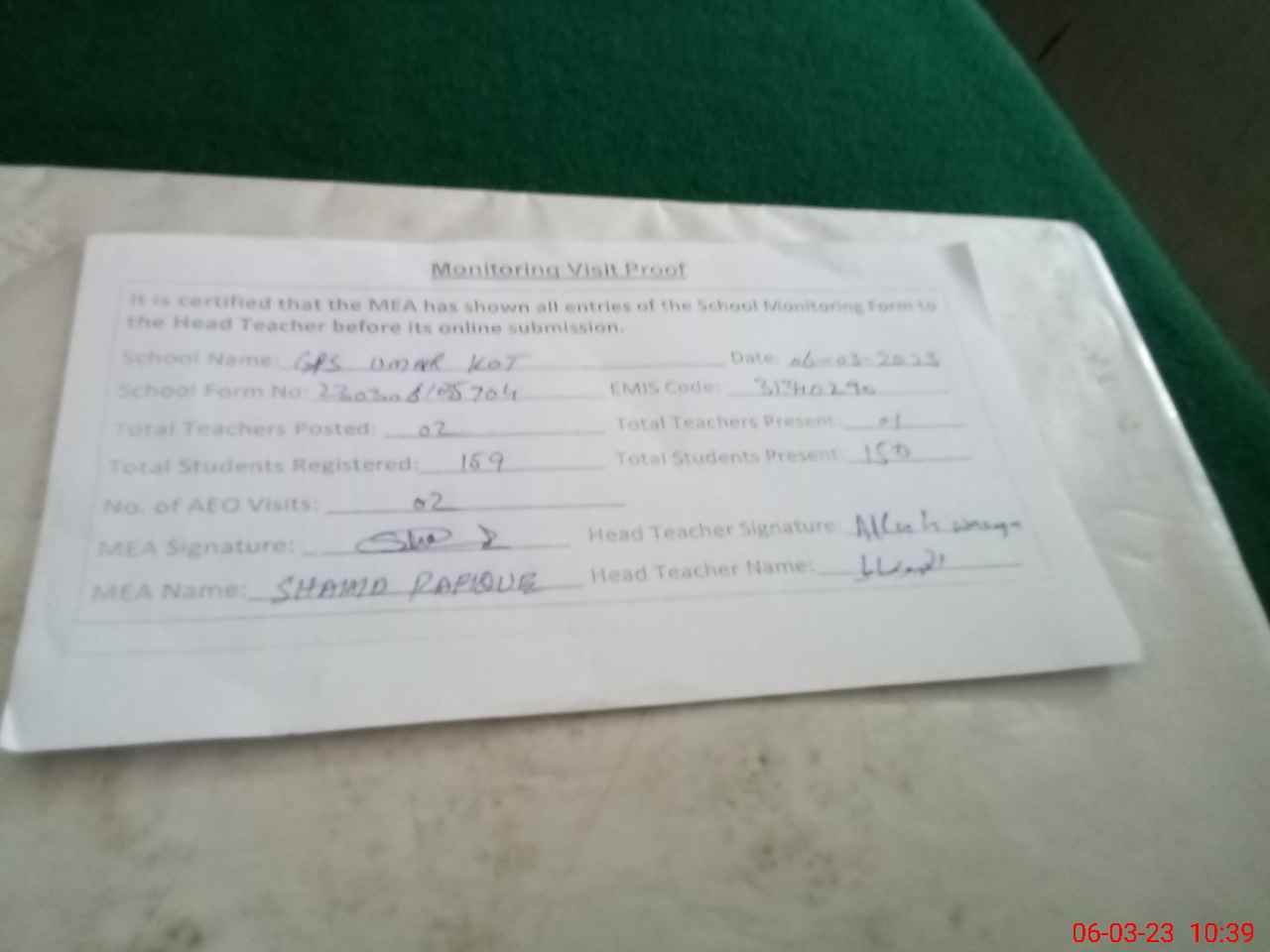 | EMIS Code: 31340290 | Name of School: GPS UMER KOT | |||