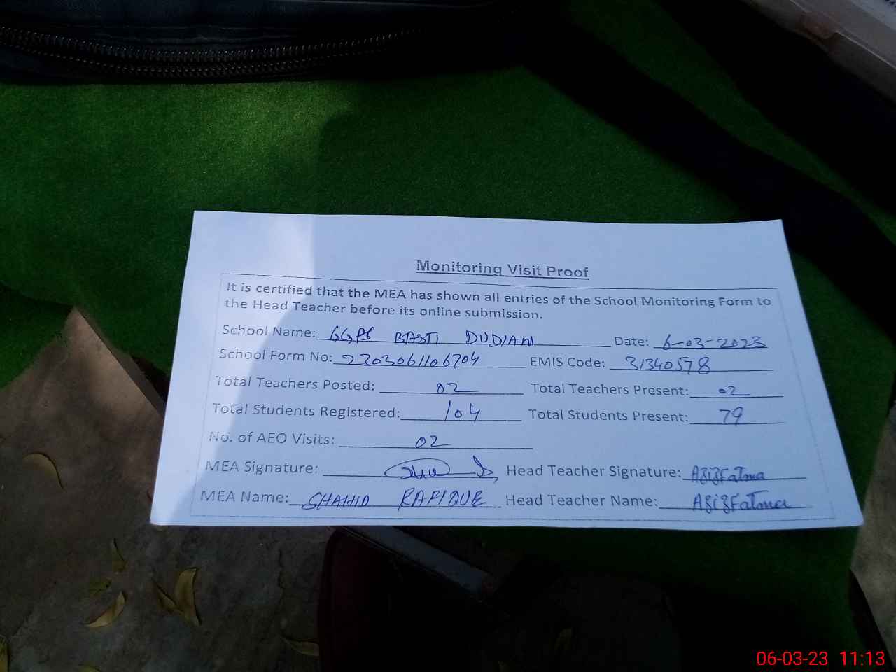 | Attendance Register | Head Teacher | MEA with School | Visit Proof |