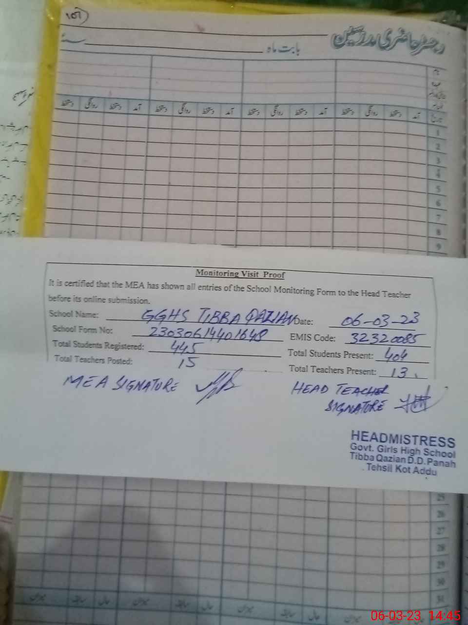 | Attendance Register | Head Teacher | MEA with School | Visit Proof |