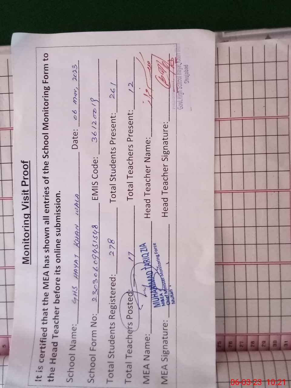 | Attendance Register | Head Teacher | MEA with School | Visit Proof |
