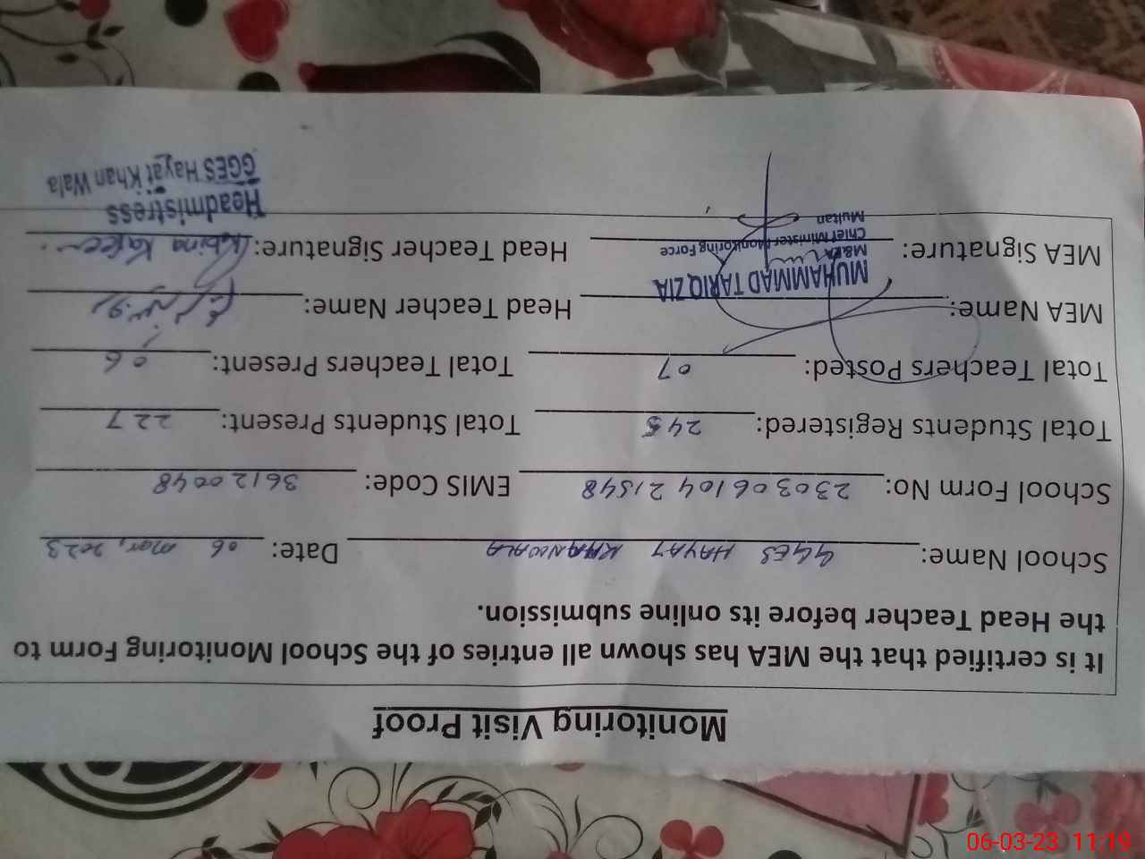 | Certified that this School was Inspected by the Undersigned MEA/DMO Today and the Information Stated Above is as Per Record. | |||||