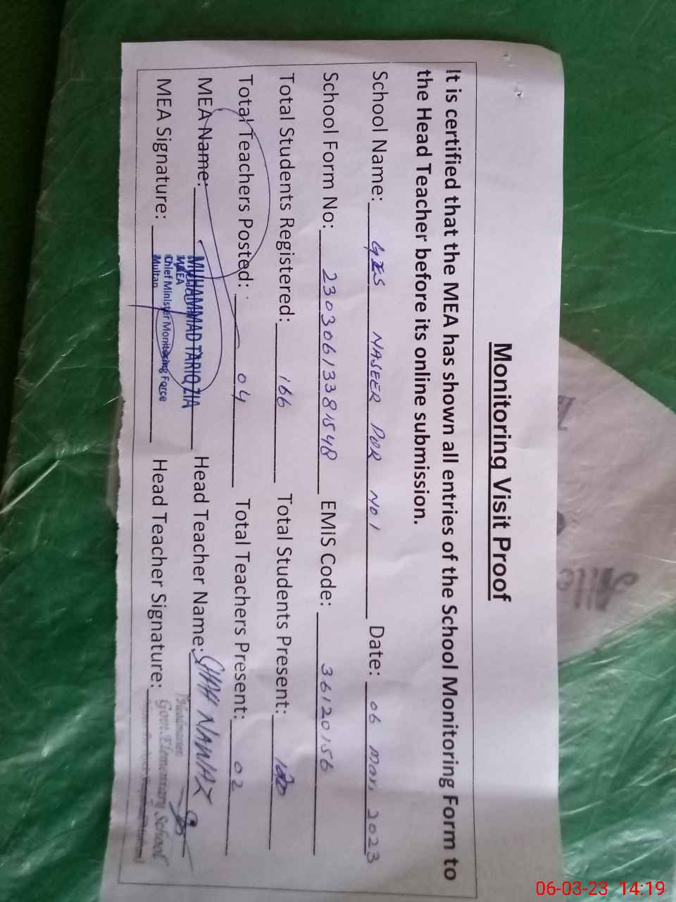 | Attendance Register | Head Teacher | MEA with School | Visit Proof |