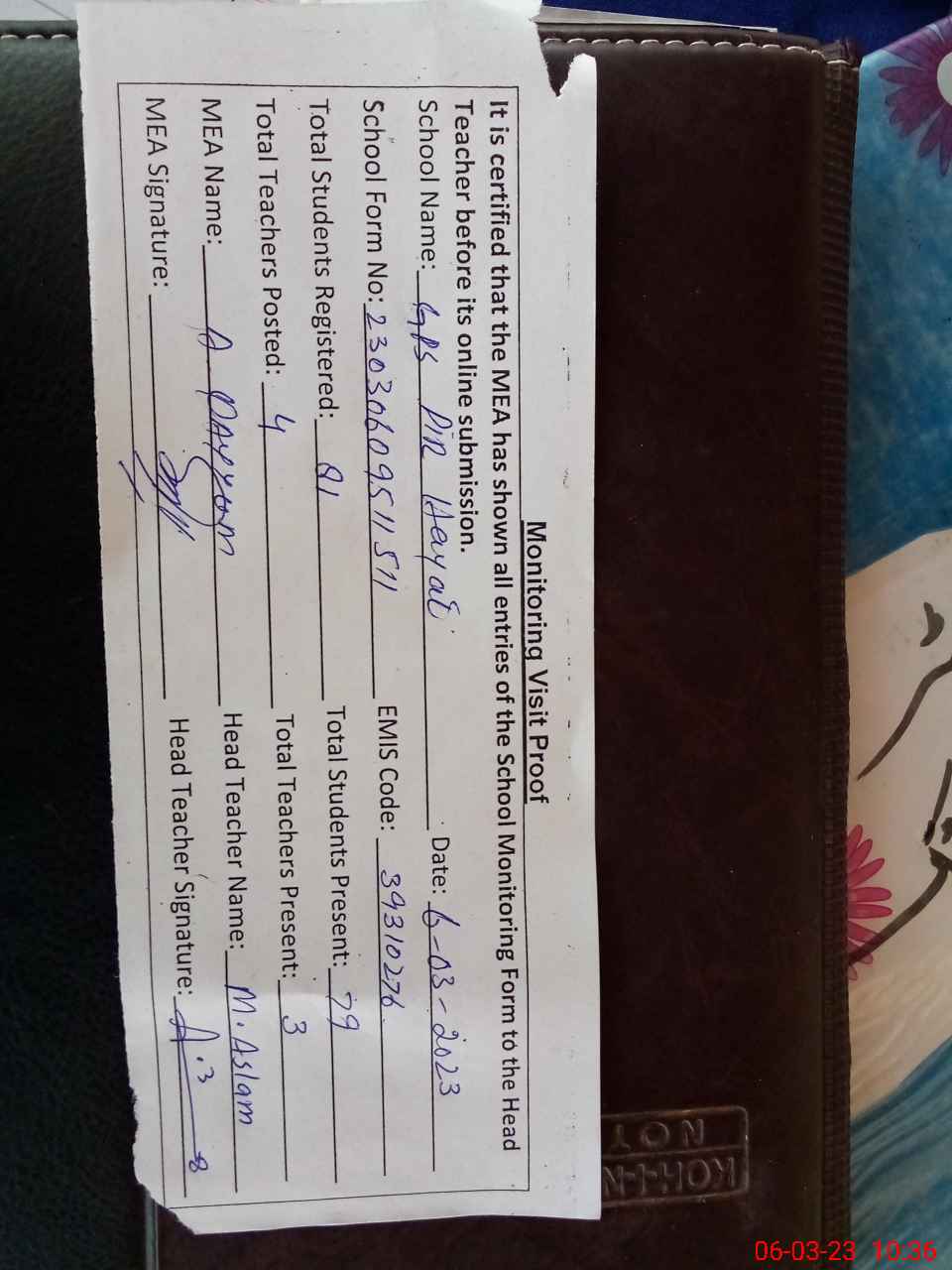| Attendance Register | Head Teacher | MEA with School | Visit Proof |