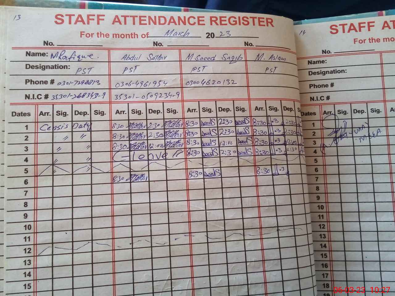 | CNIC | Full Name | Designation | R/C | Absence During Last Calender Month |