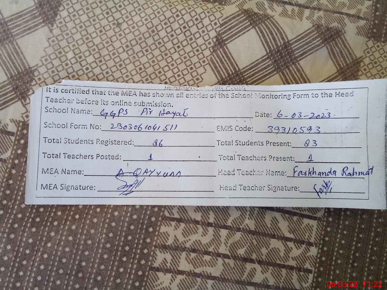 | EMIS Code: 39310593 | Name of School: GGPS PIR HAYAT | |||