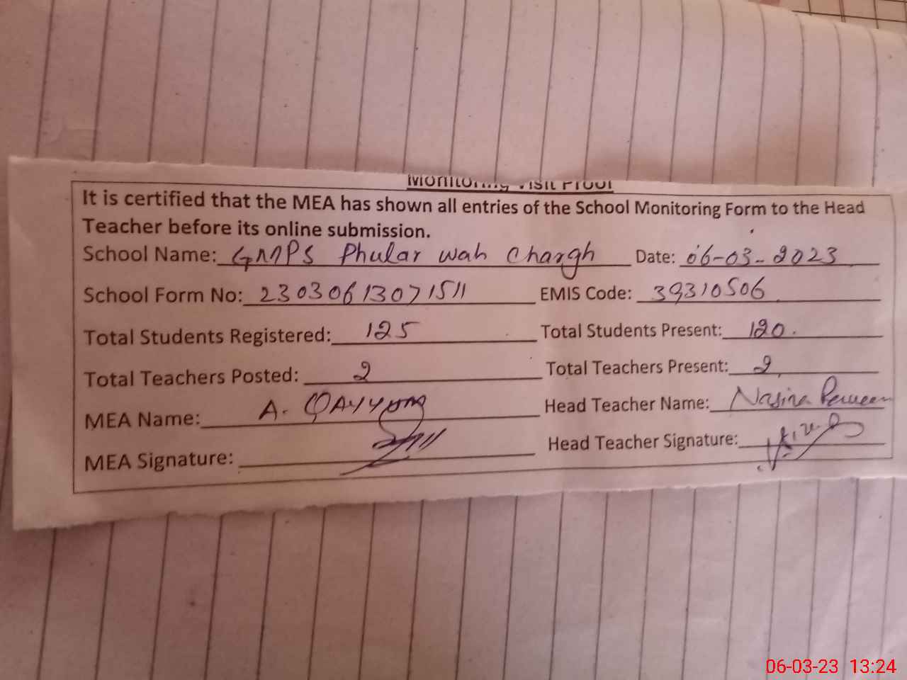 | Attendance Register | Head Teacher | MEA with School | Visit Proof |