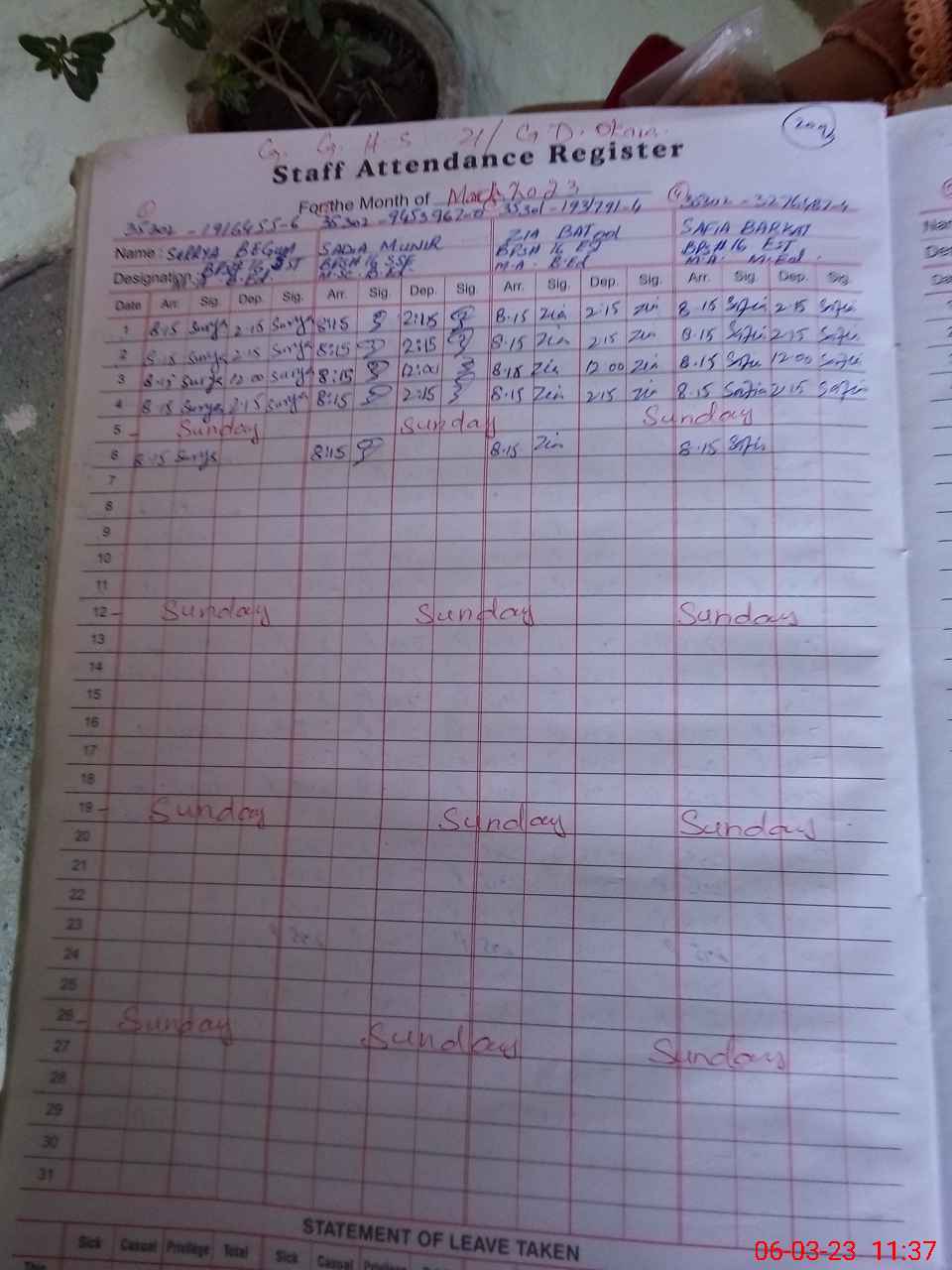 | CNIC | Full Name | Designation | R/C | Absence During Last Calender Month |