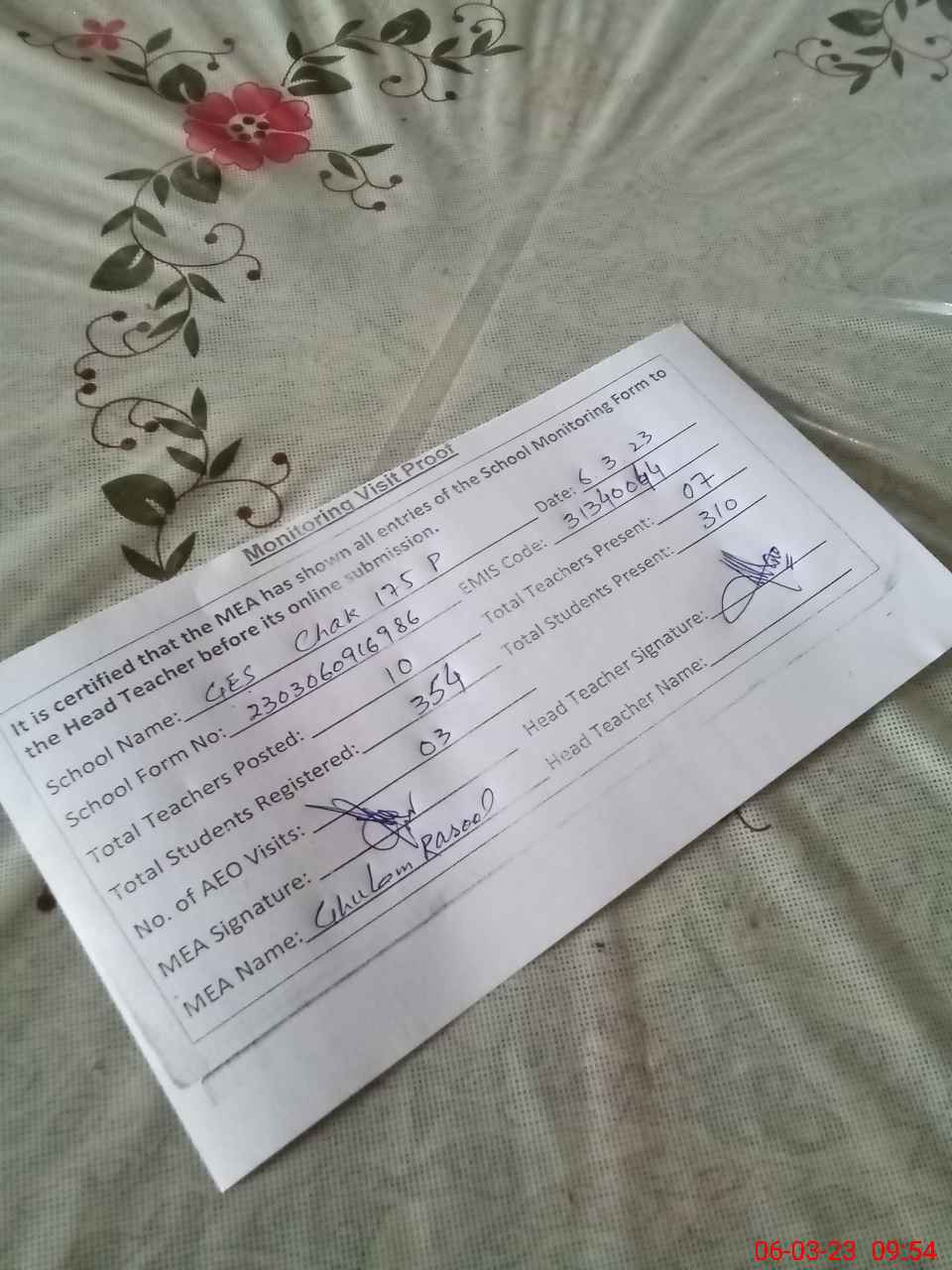 | EMIS Code: 31340044 | Name of School: GES CHAK NO 175/P | |||