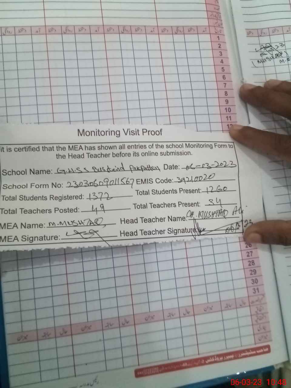 | Attendance Register | Head Teacher | MEA with School | Visit Proof |