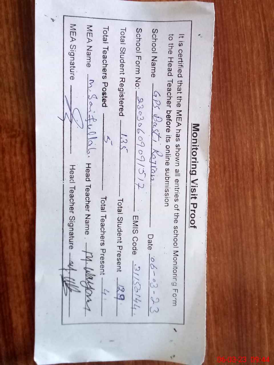 | Attendance Register | Head Teacher | MEA with School | Visit Proof |