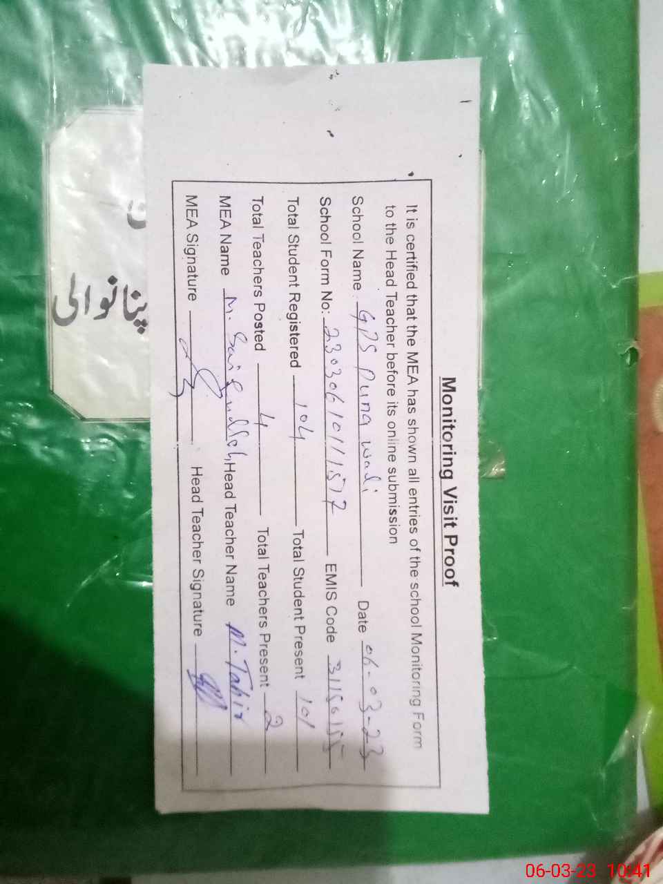 | Attendance Register | Head Teacher | MEA with School | Visit Proof |