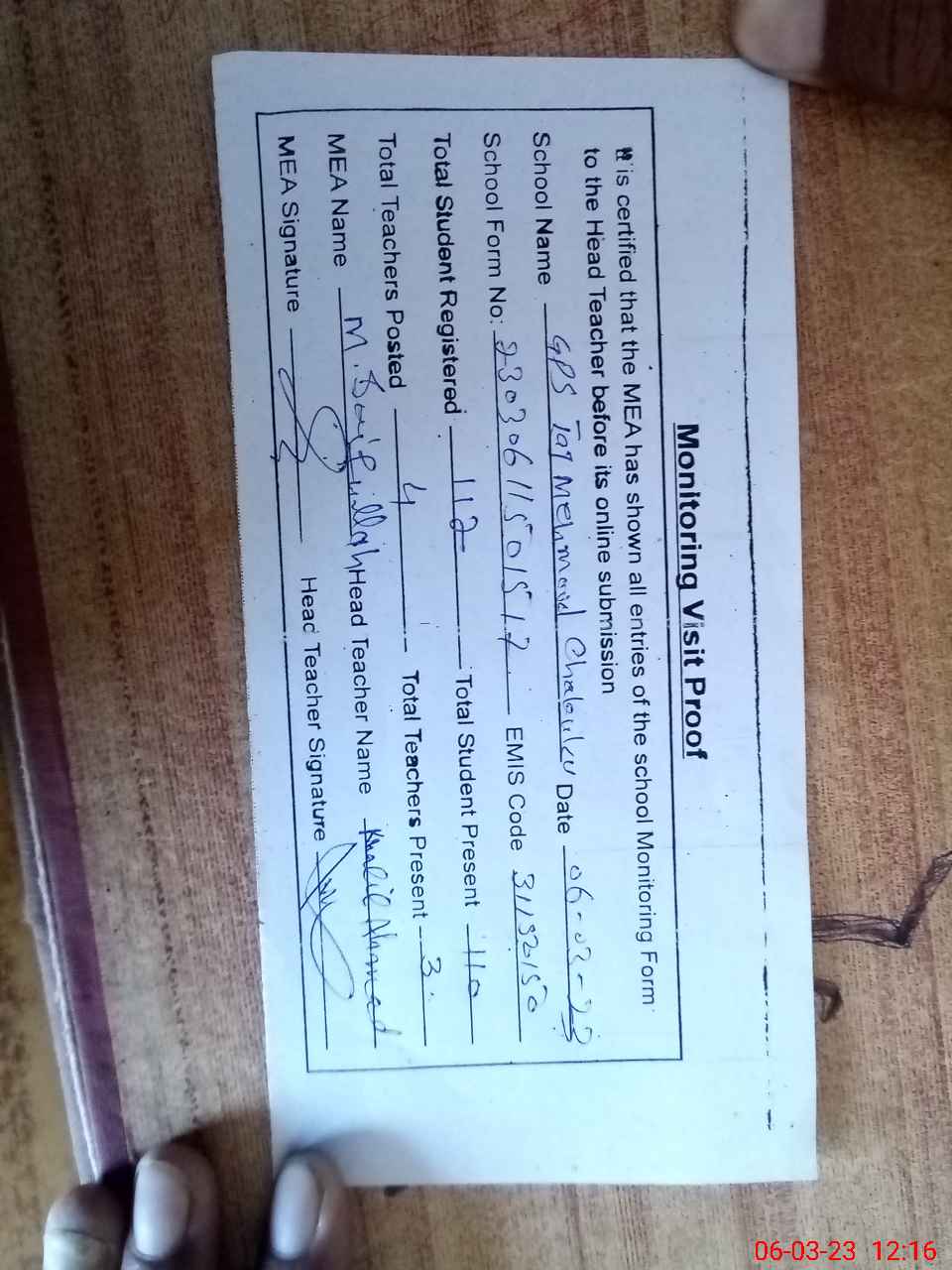 | EMIS Code: 31150150 | Name of School: GPS TAJ MEHMOOD CHAKUKA | |||