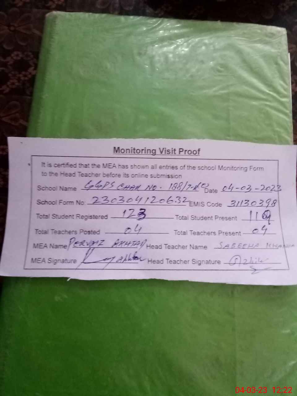 | EMIS Code: 31130398 | Name of School: GGPS CHAK NO 188/7-R E | |||