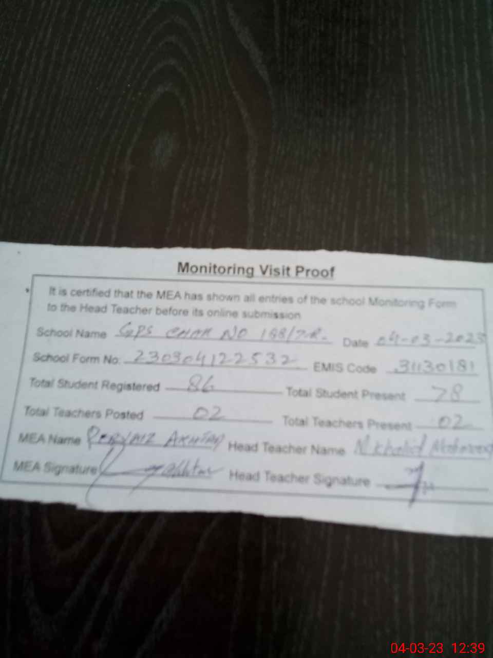 | Attendance Register | Head Teacher | MEA with School | Visit Proof |