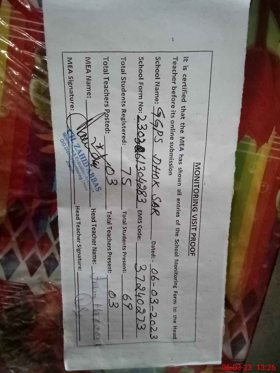 | Attendance Register | Head Teacher | MEA with School | Visit Proof |