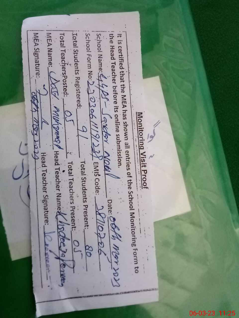 | Attendance Register | Head Teacher | MEA with School | Visit Proof |