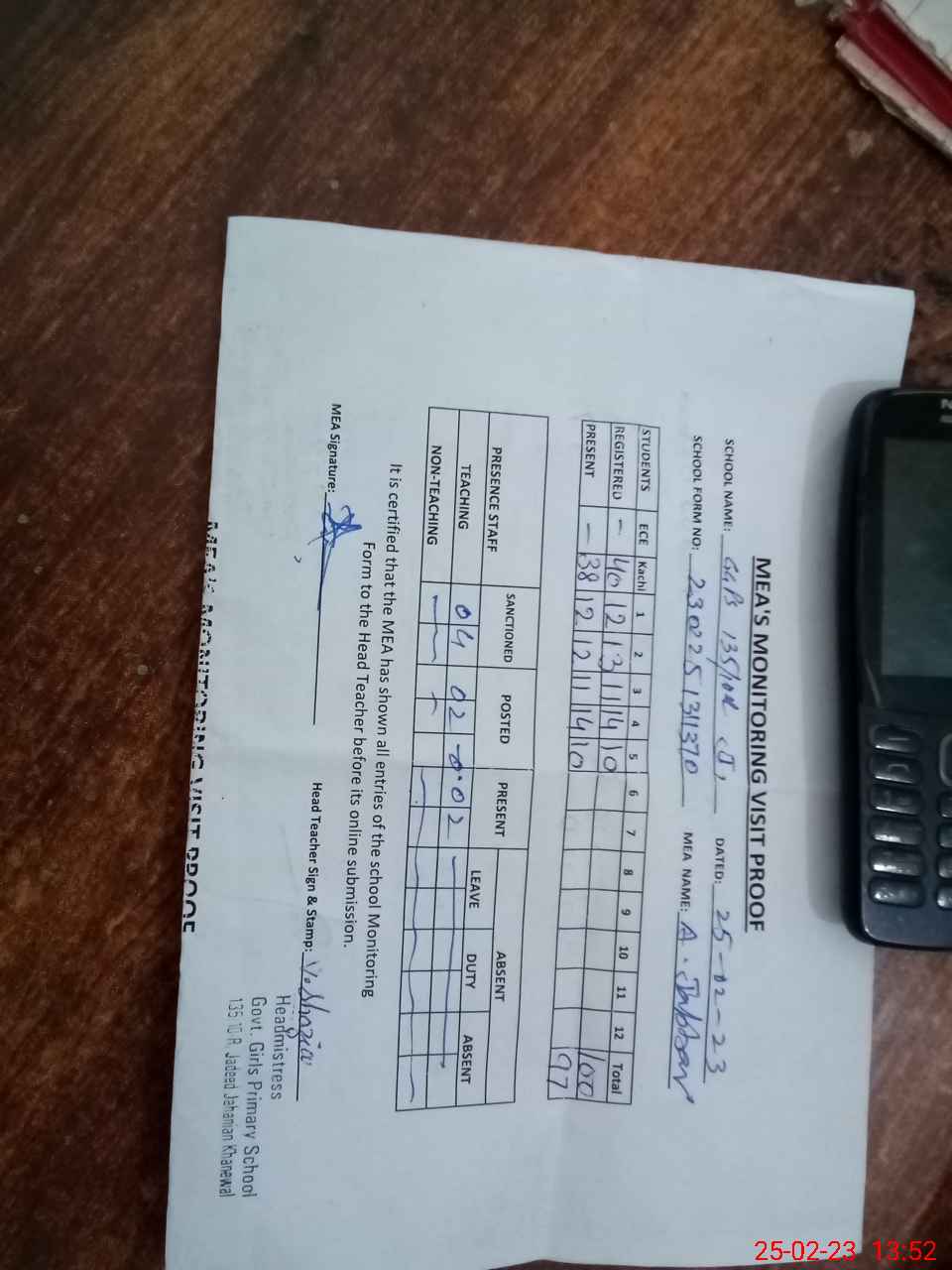 | Attendance Register | Head Teacher | MEA with School | Visit Proof |