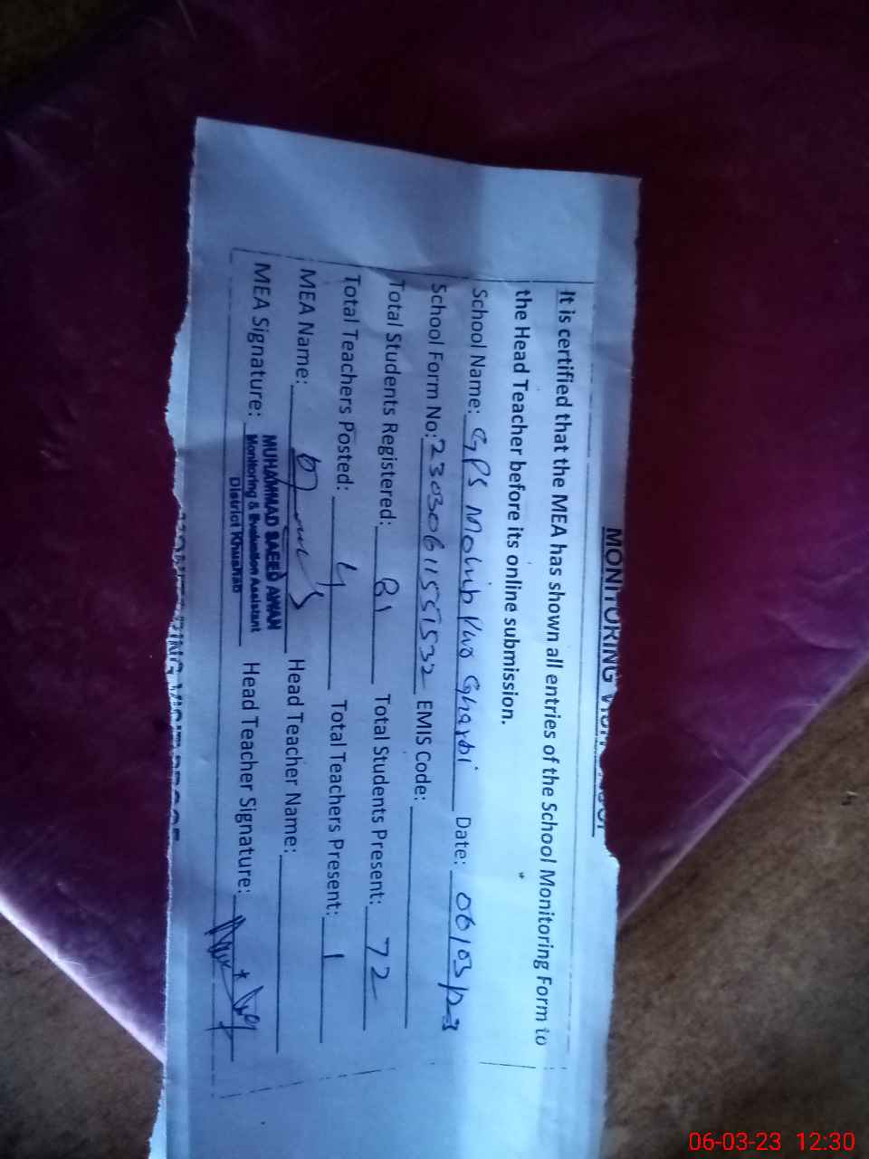 | EMIS Code: 38210289 | Name of School: GPS MUHIB PUR GHARBI | |||