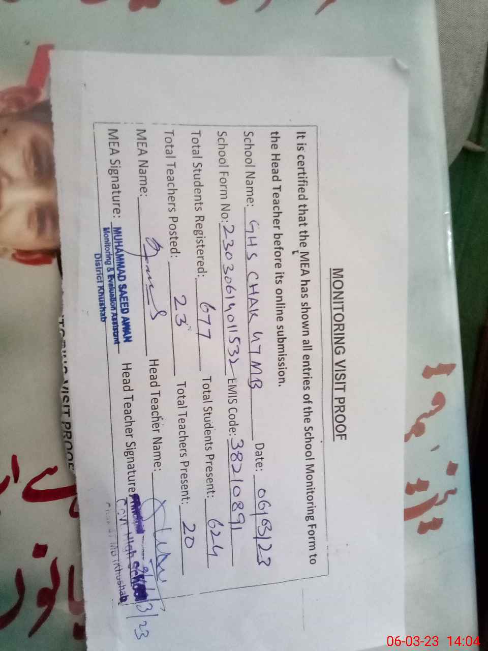 | EMIS Code: 38210891 | Name of School: GHS CHAK NO. 47/MB | |||