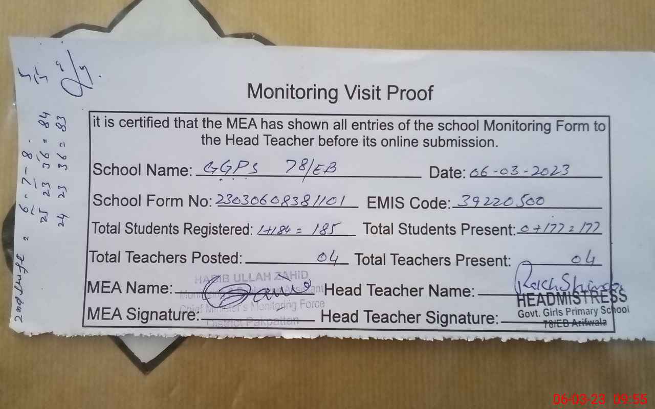 | EMIS Code: 39220500 | Name of School: GGES CHAK NO.78 EB | |||
