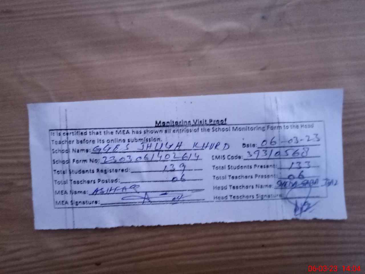 | Attendance Register | Head Teacher | MEA with School | Visit Proof |