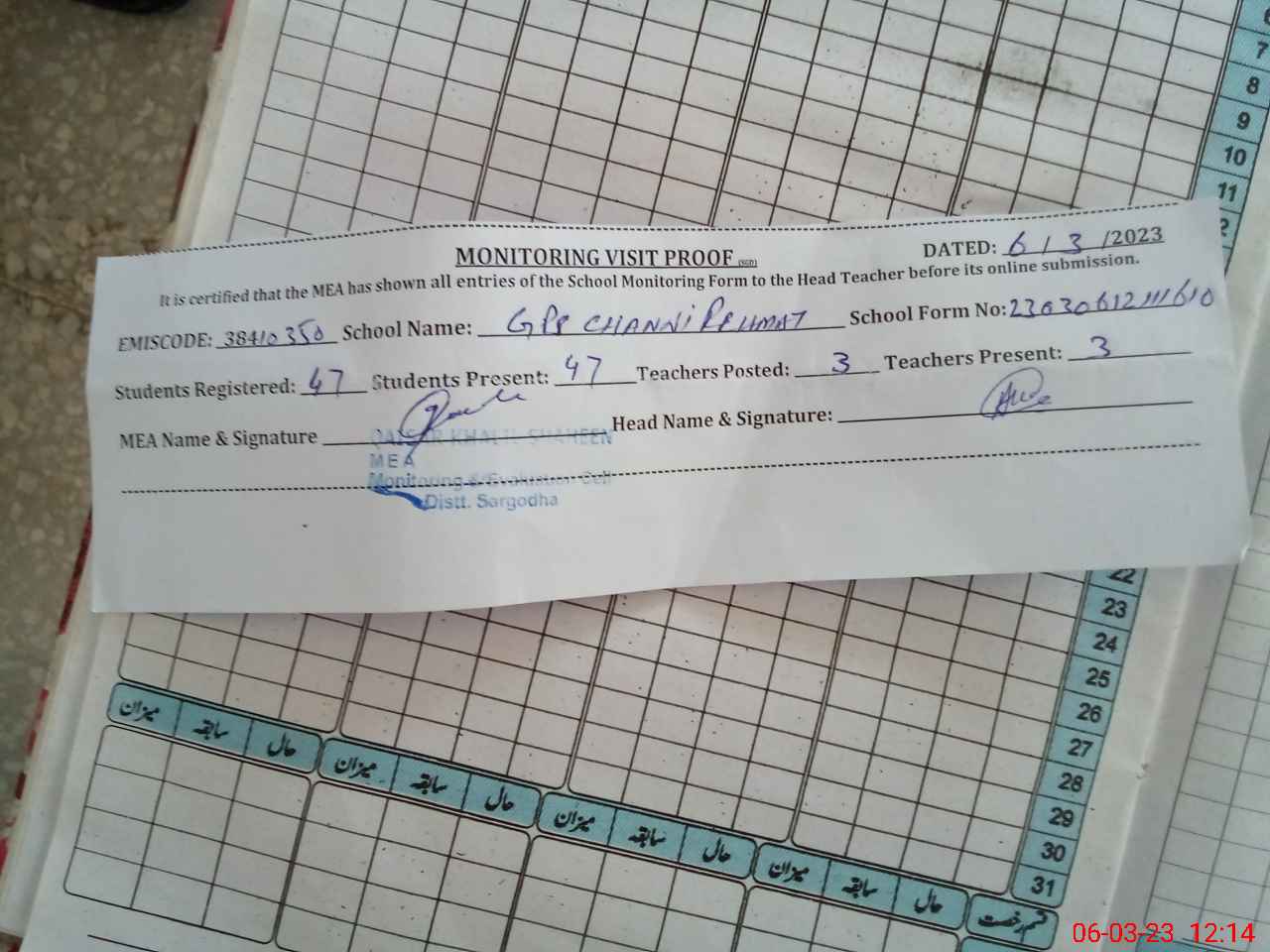 | Attendance Register | Head Teacher | MEA with School | Visit Proof |