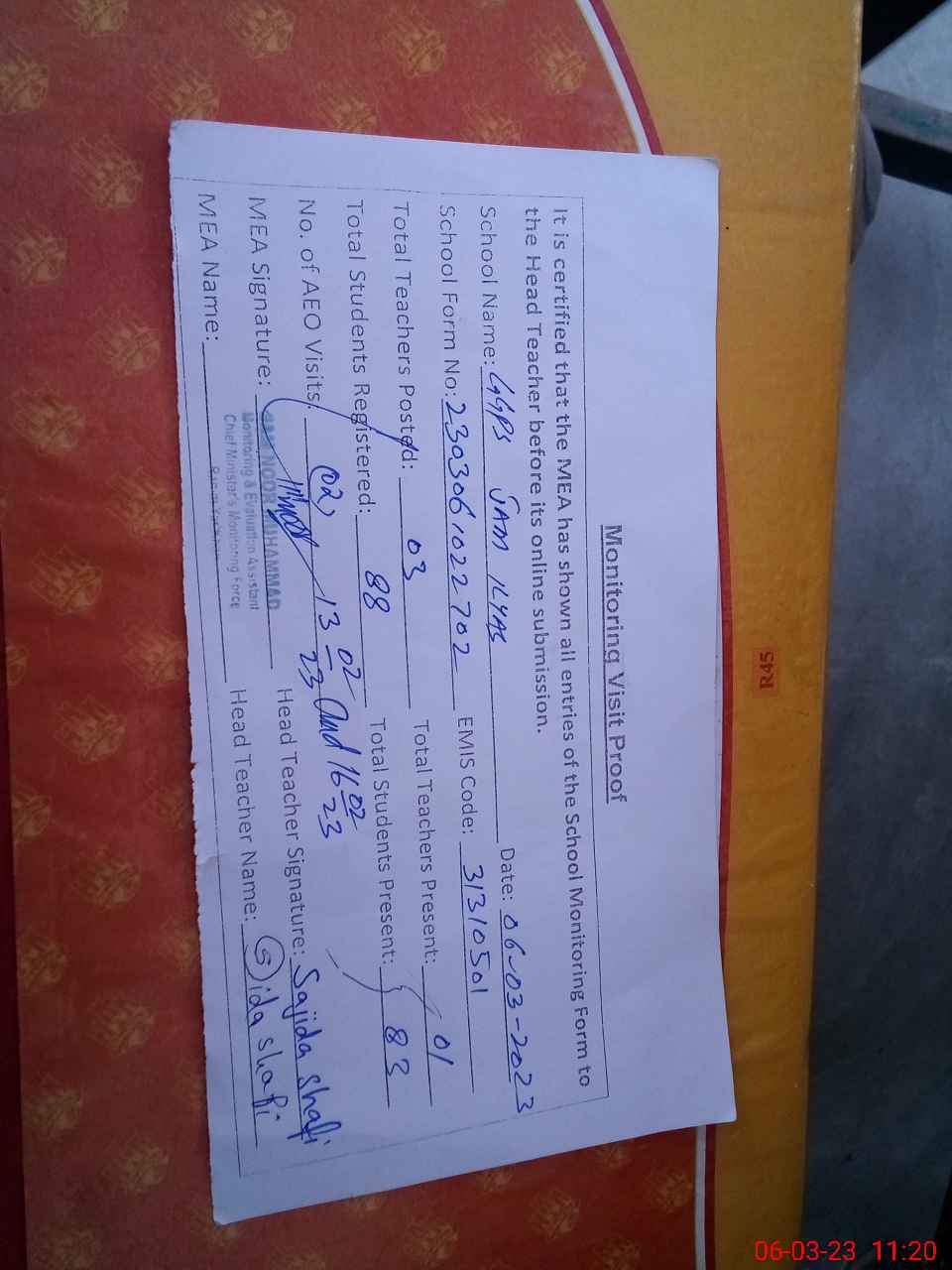 | EMIS Code: 31310501 | Name of School: GGPS JAM ILYAS | |||