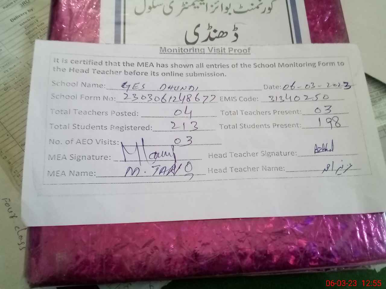 | Attendance Register | Head Teacher | MEA with School | Visit Proof |
