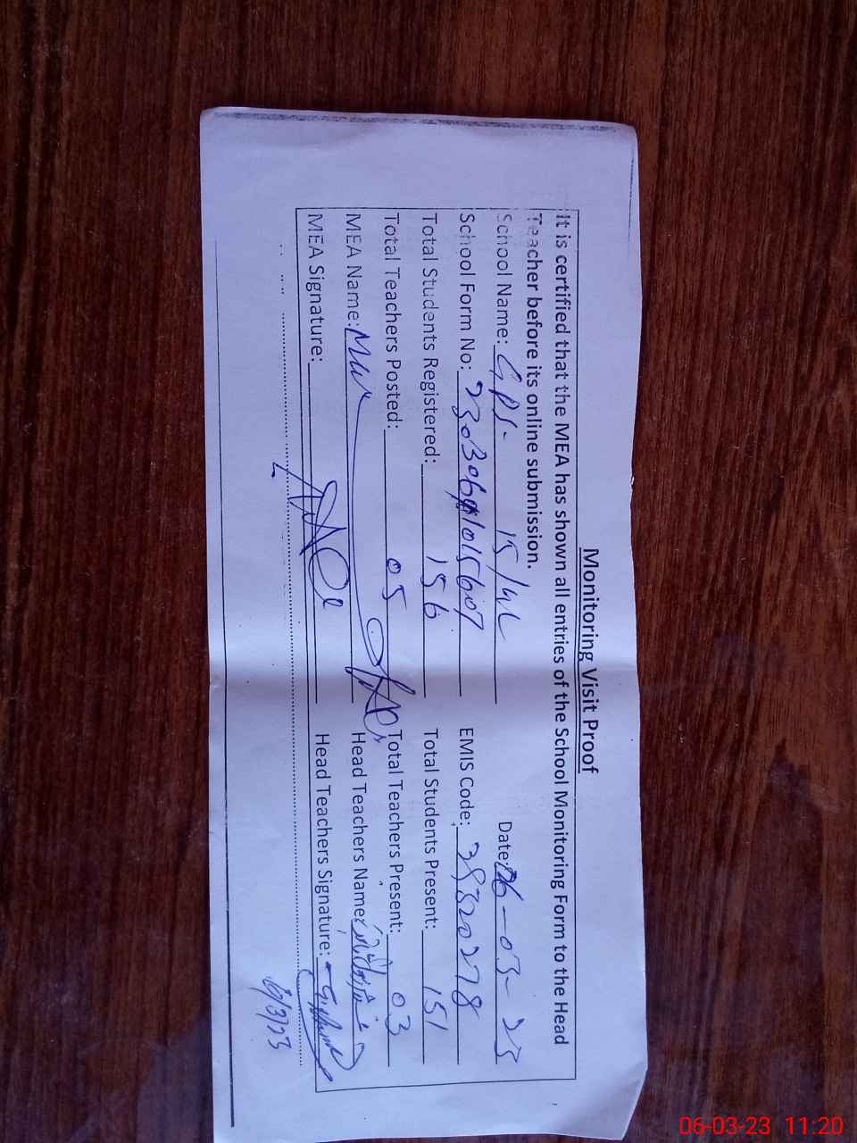 | Attendance Register | Head Teacher | MEA with School | Visit Proof |