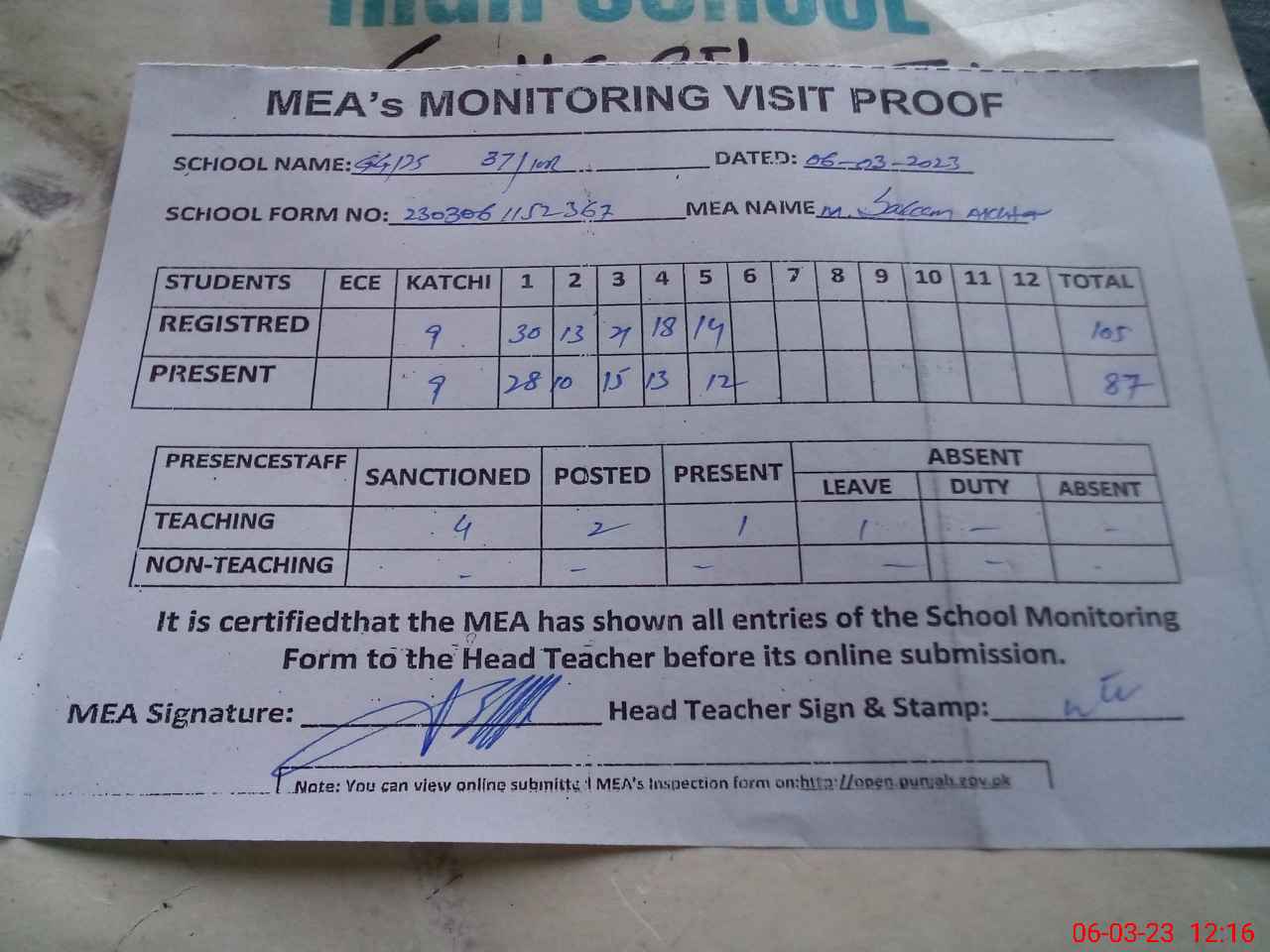 | Attendance Register | Head Teacher | MEA with School | Visit Proof |