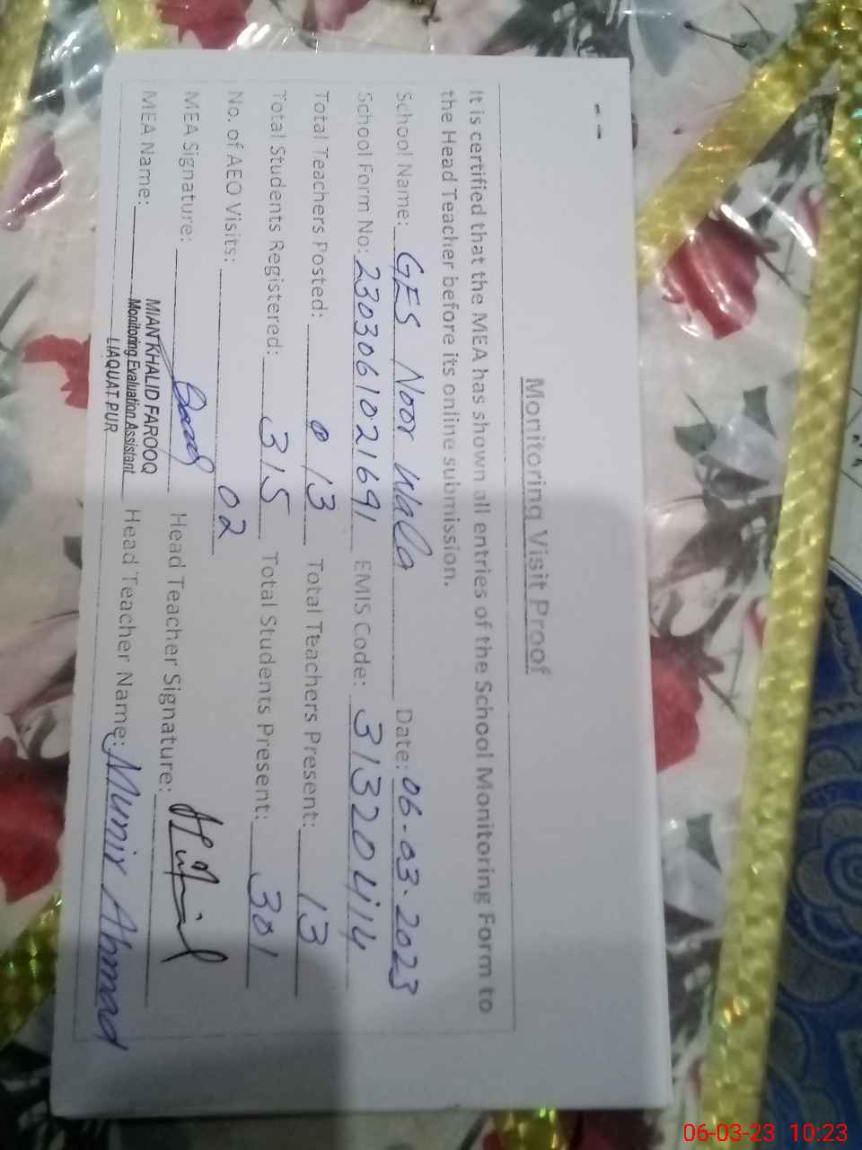 | Attendance Register | Head Teacher | MEA with School | Visit Proof |