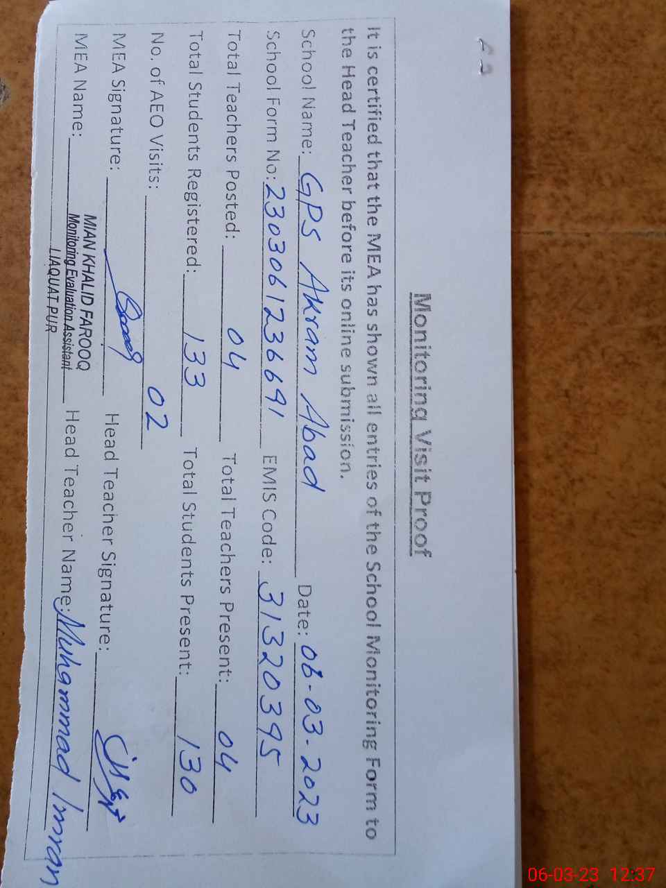 | EMIS Code: 31320395 | Name of School: GPS AKRAM ABAD | |||