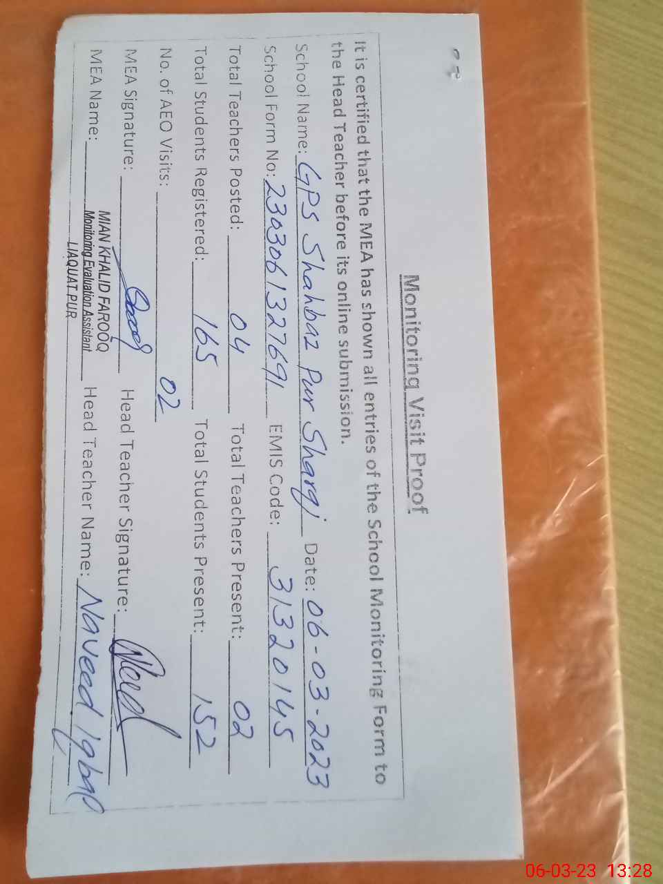 | Attendance Register | Head Teacher | MEA with School | Visit Proof |