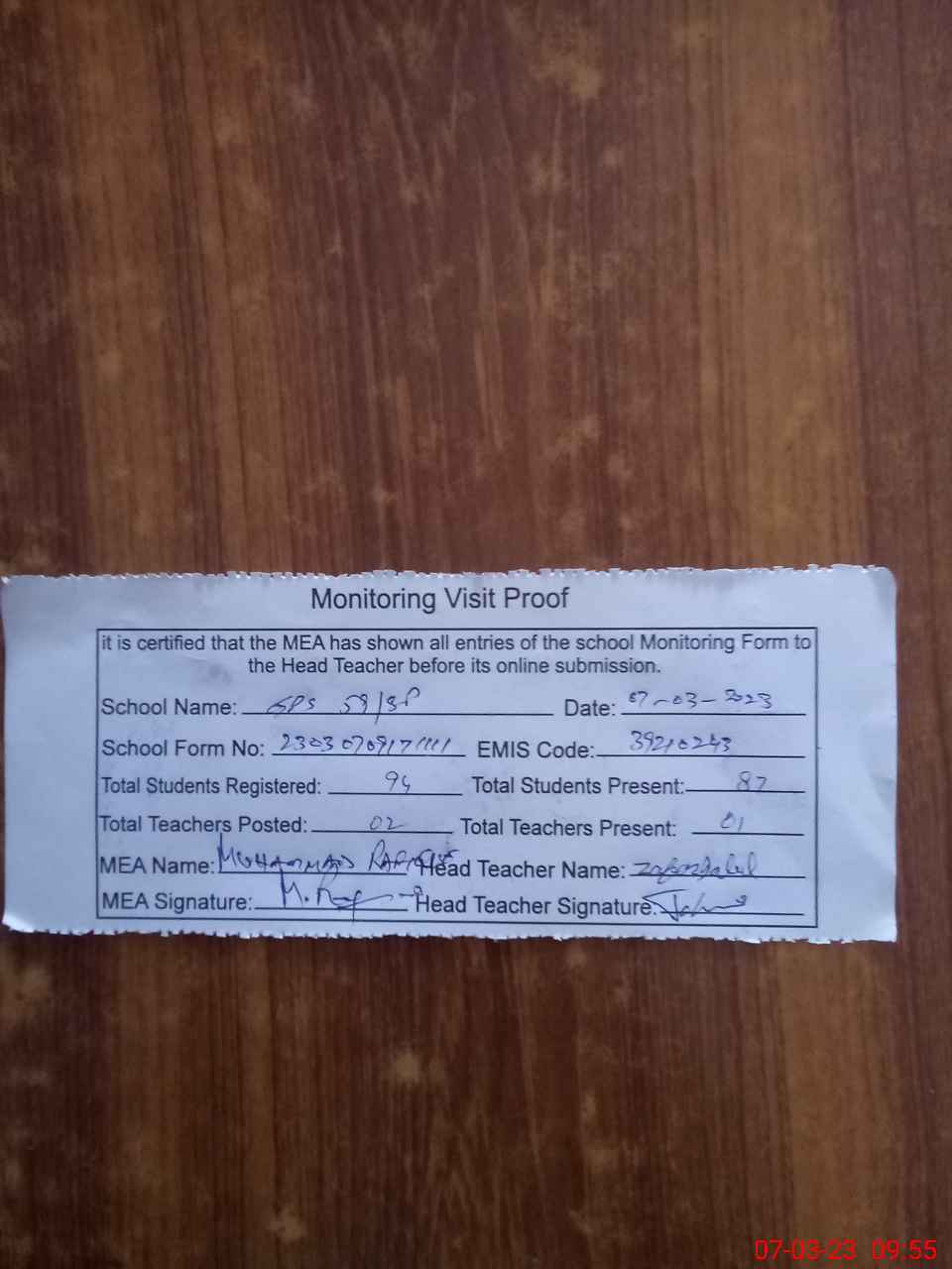 | Certified that this School was Inspected by the Undersigned MEA/DMO Today and the Information Stated Above is as Per Record. | |||||