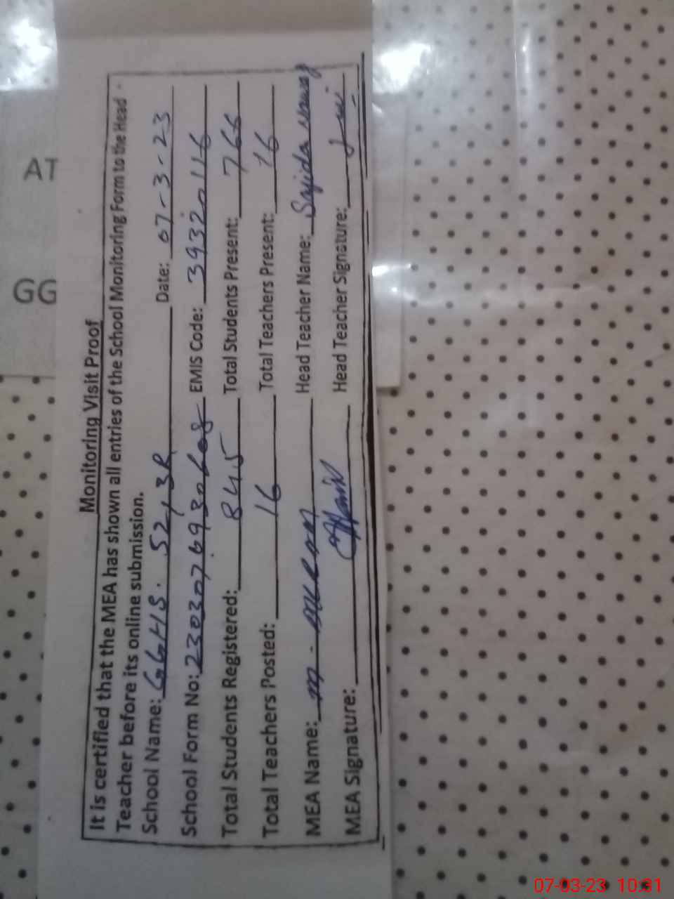 | Attendance Register | Head Teacher | MEA with School | Visit Proof |