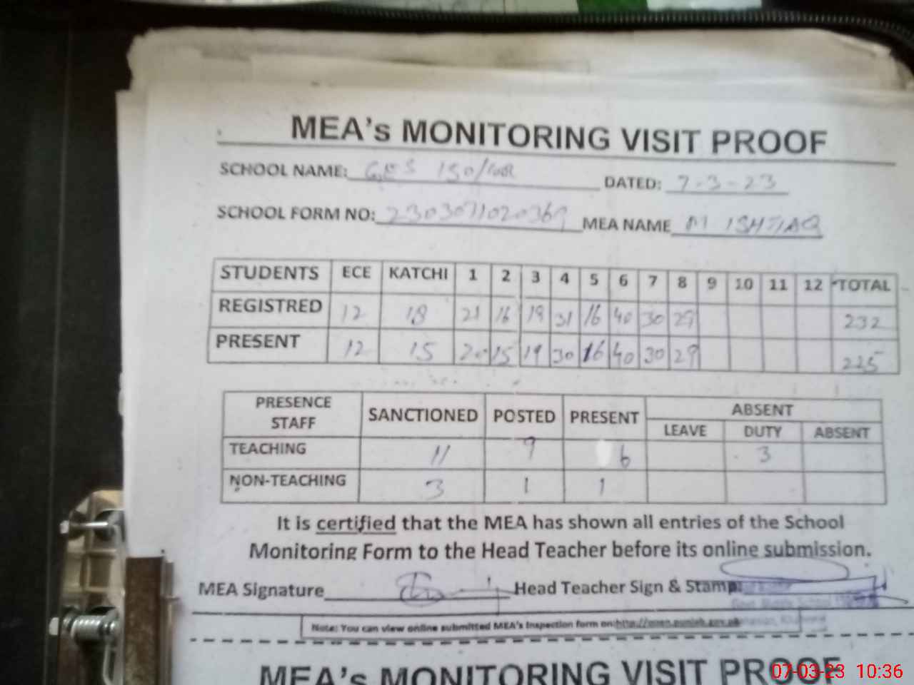 | Attendance Register | Head Teacher | MEA with School | Visit Proof |