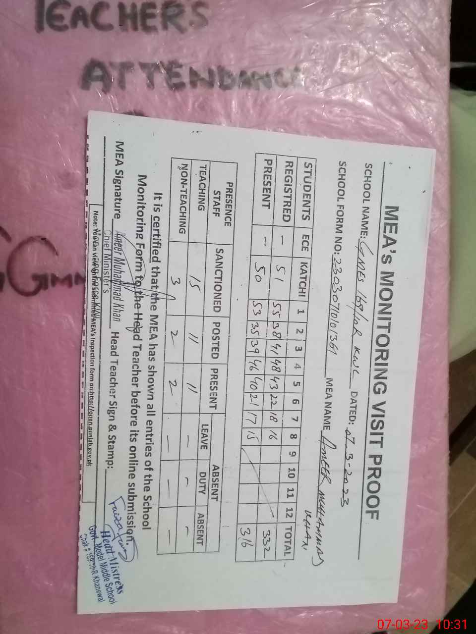 | Attendance Register | Head Teacher | MEA with School | Visit Proof |