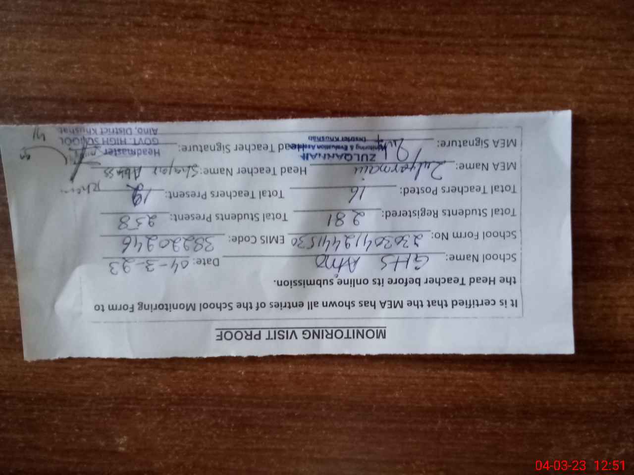 | Name: Sh**** Ab**** Designation: (School Headmaster's/Headmistress's) HEADMASTER Phone/Cell Number: 03**** |