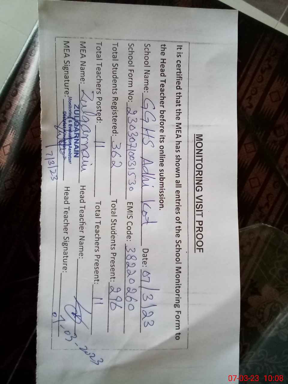 | EMIS Code: 38220260 | Name of School: GGHS ADHI KOT | |||