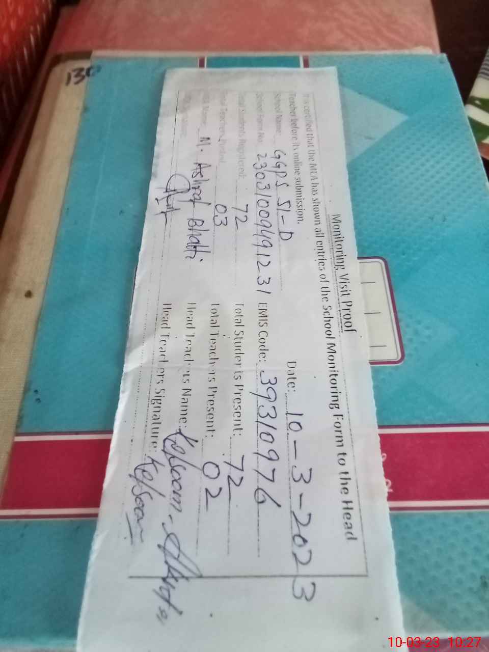 | Attendance Register | Head Teacher | MEA with School | Visit Proof |