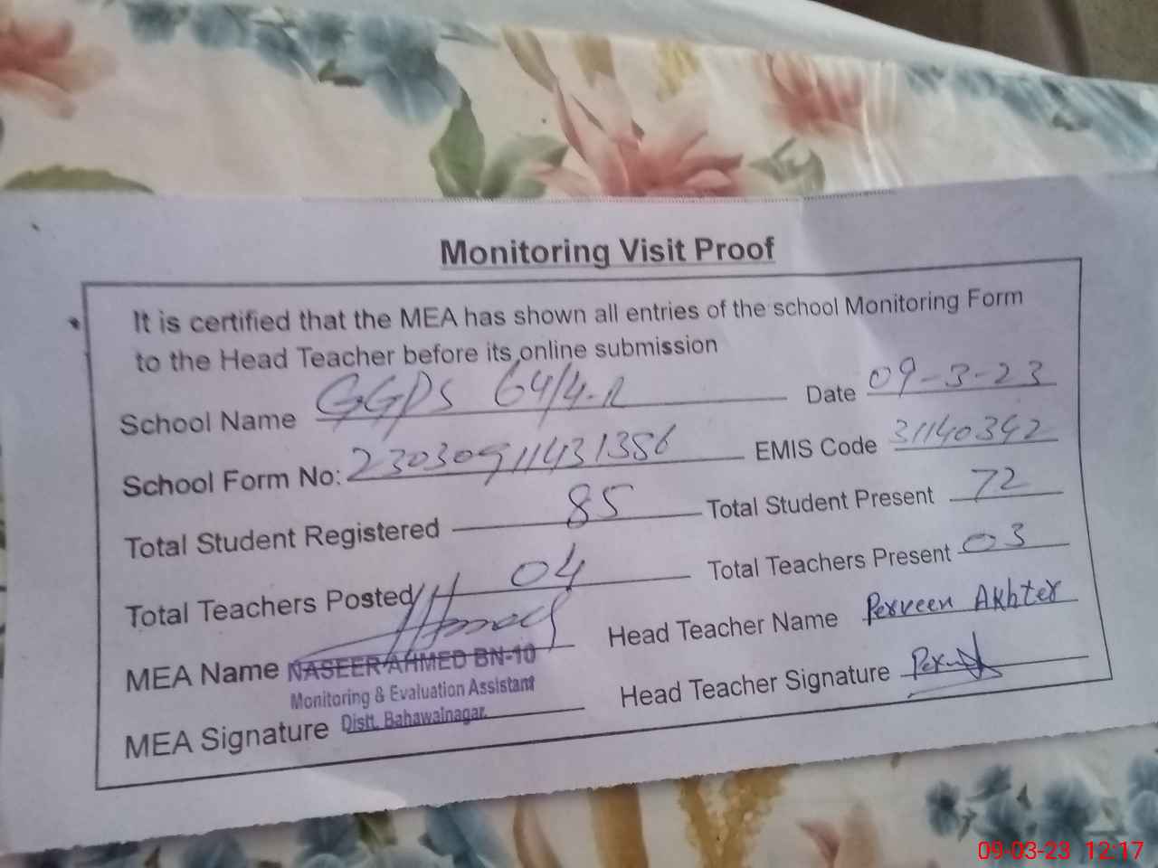 | Attendance Register | Head Teacher | MEA with School | Visit Proof |