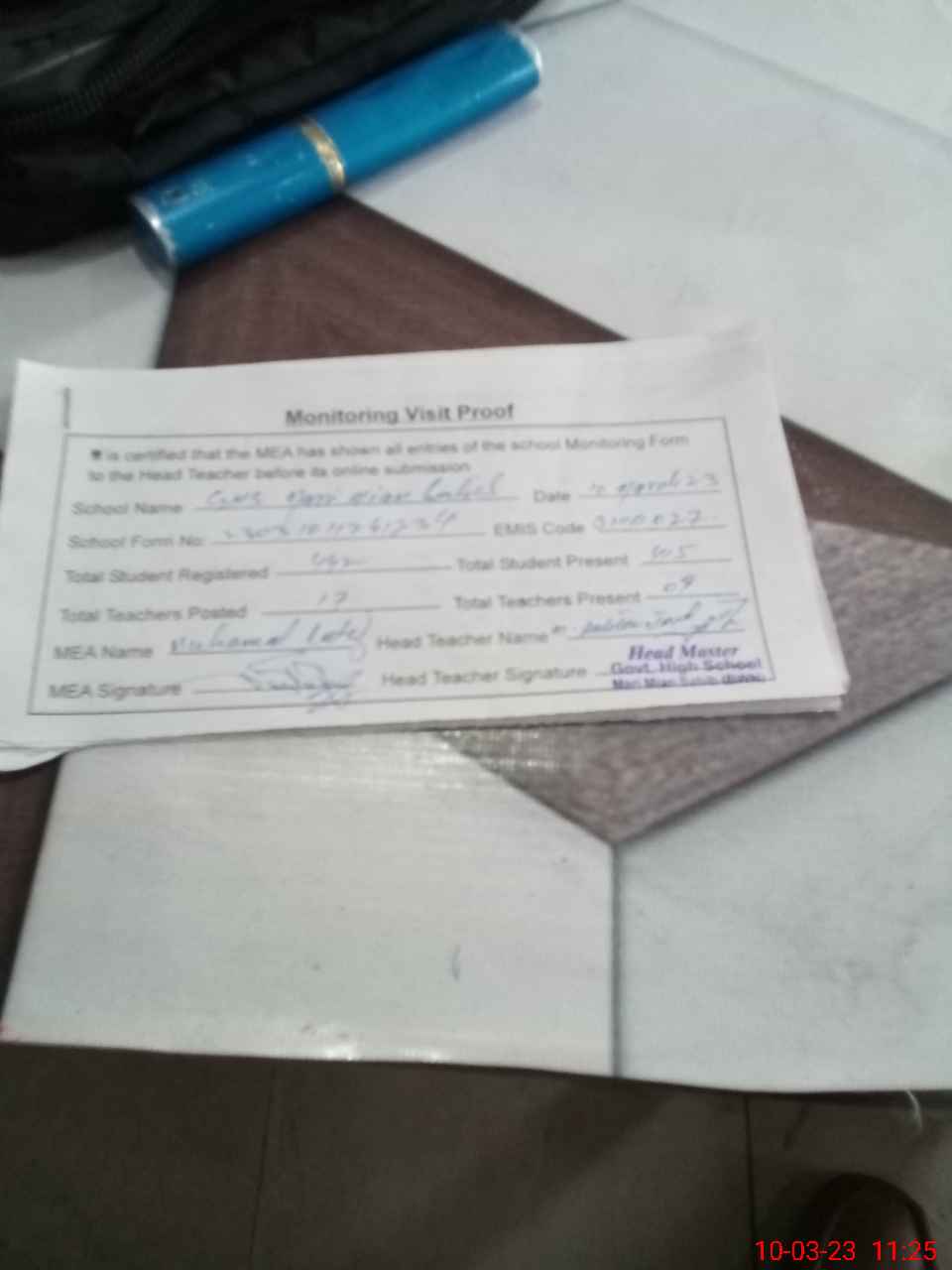 | Attendance Register | Head Teacher | MEA with School | Visit Proof |