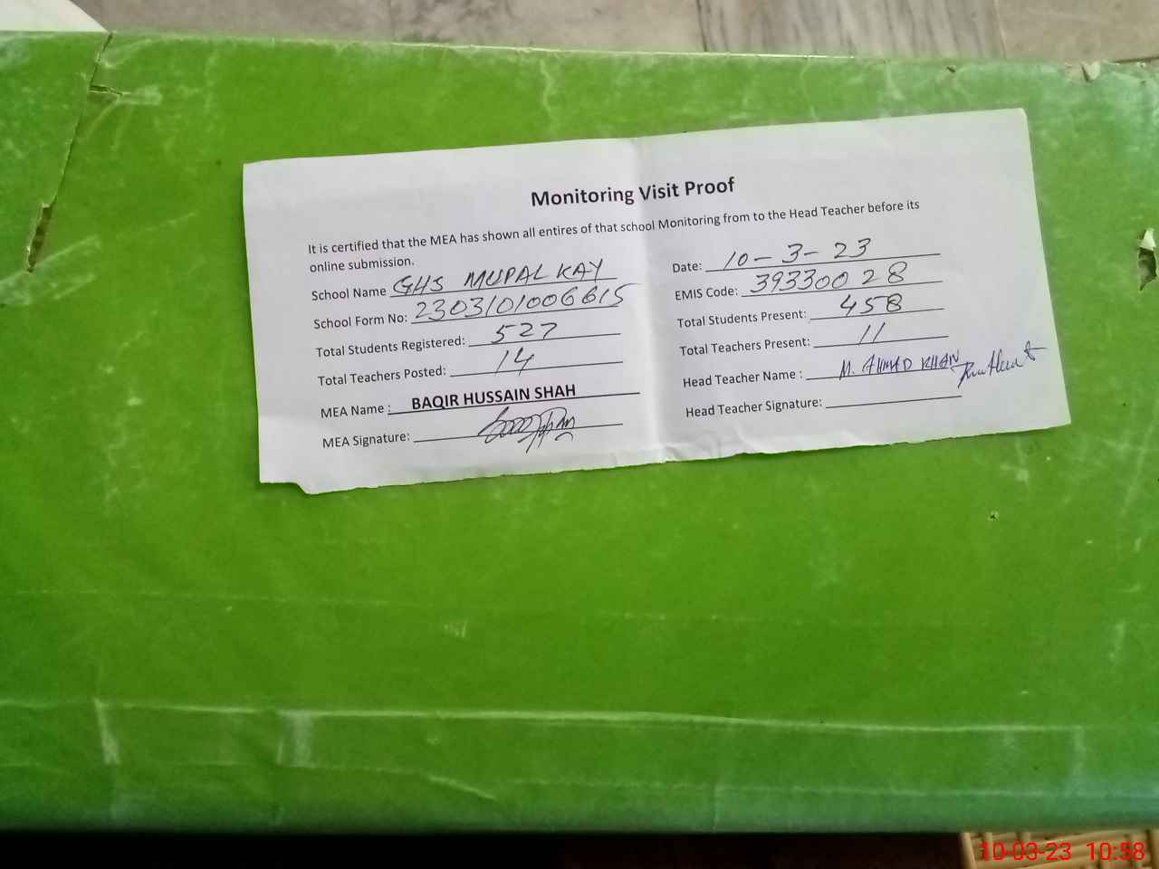 | Certified that this School was Inspected by the Undersigned MEA/DMO Today and the Information Stated Above is as Per Record. | |||||